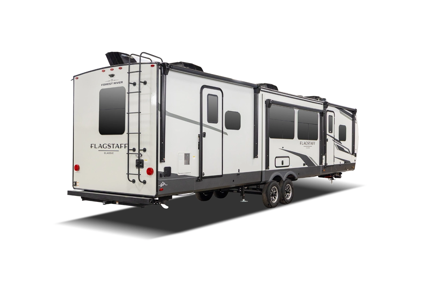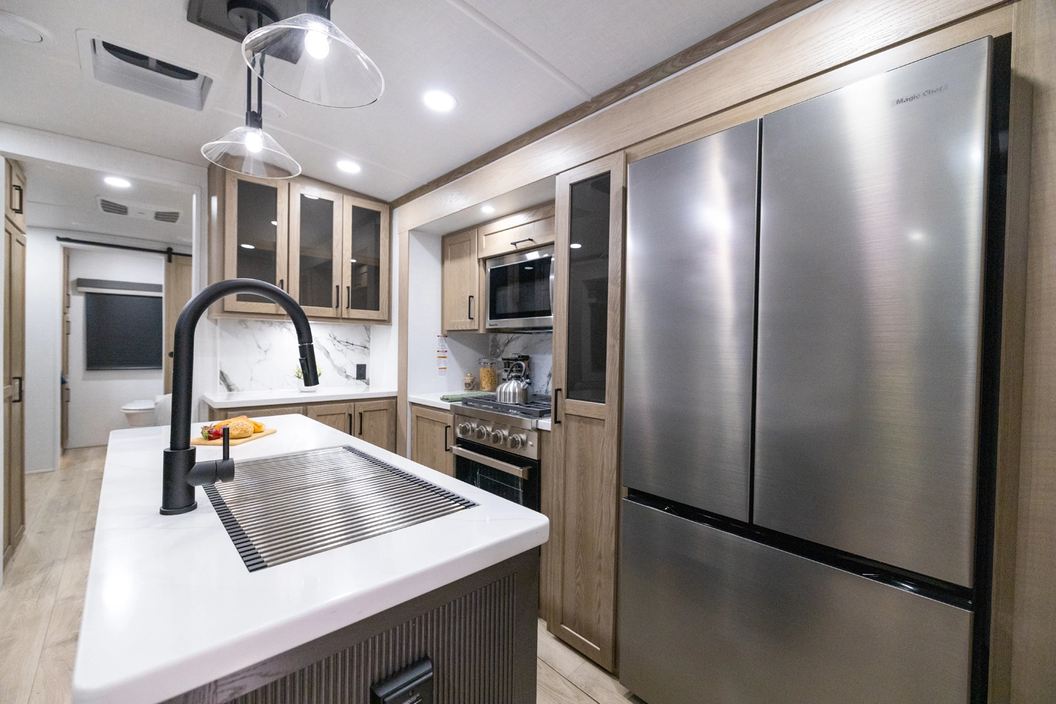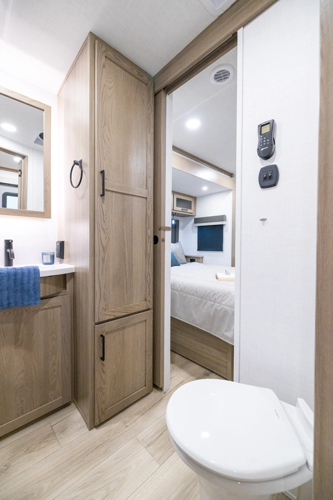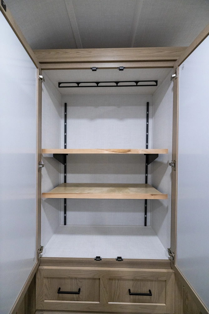 This spacious dual bedroom floorplan features a rear king suite with a full bath and a front queen bedroom with its own bath as well. Between them is a large open living area with a U-shaped dinette, theater seating, fireplace and well-equipped kitchen with an island. 4 slide outs widen the space, maximizing comfort and storage for families or couples.