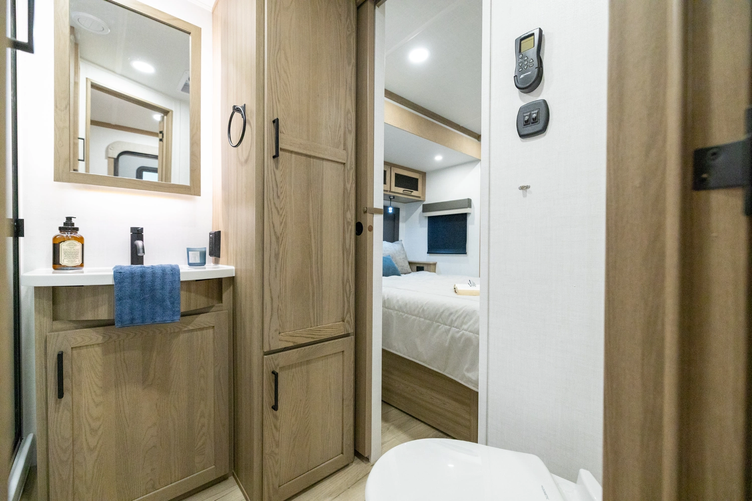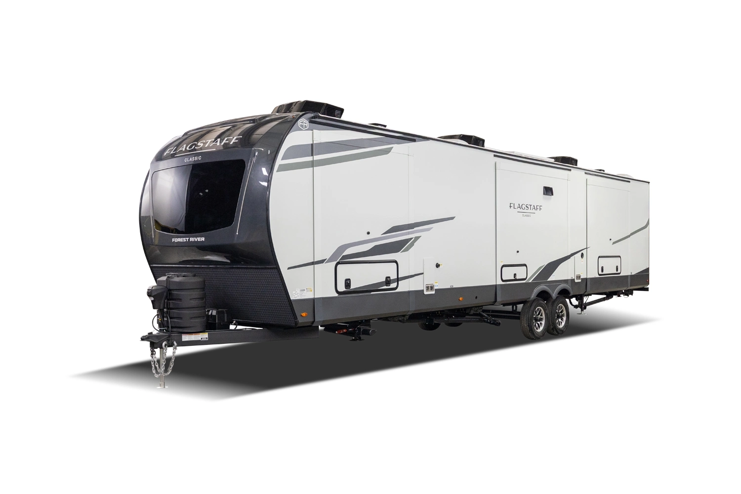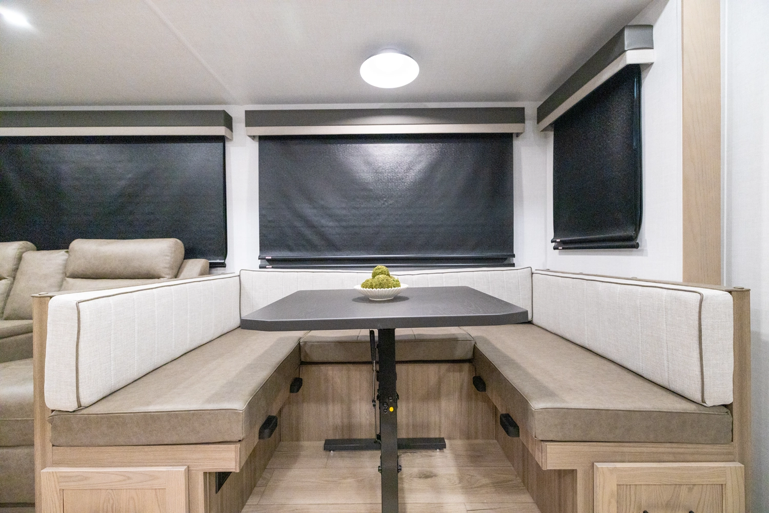 This spacious dual bedroom floorplan features a rear king suite with a full bath and a front queen bedroom with its own bath as well. Between them is a large open living area with a U-shaped dinette, theater seating, fireplace and well-equipped kitchen with an island. 4 slide outs widen the space, maximizing comfort and storage for families or couples.