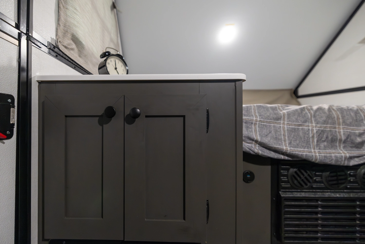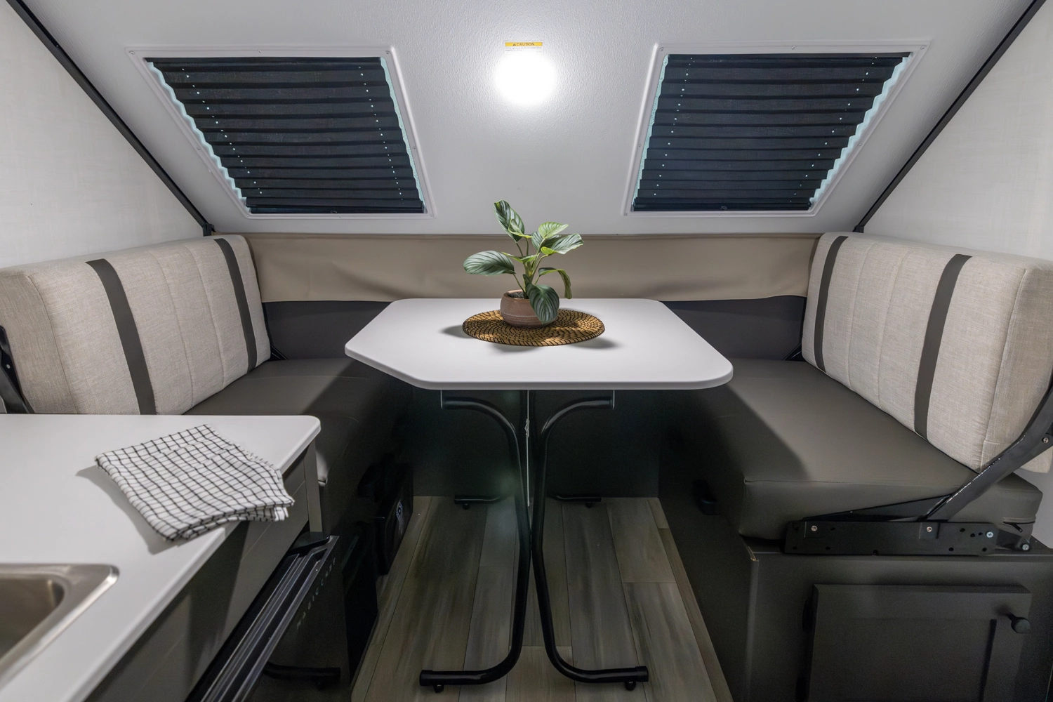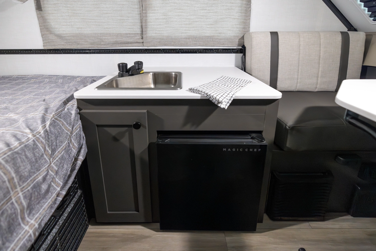 The Flagstaff T10RB is a traditional A-frame that blends simplicity with smart design. It features a front 33" x 80" dinette and a rear 54" x 80" bed that flips up for easy access. Inside, you'll have a convenient fridge, and outside, EZ-reach storage trunk and a griddle for cooking up meals wherever you go.