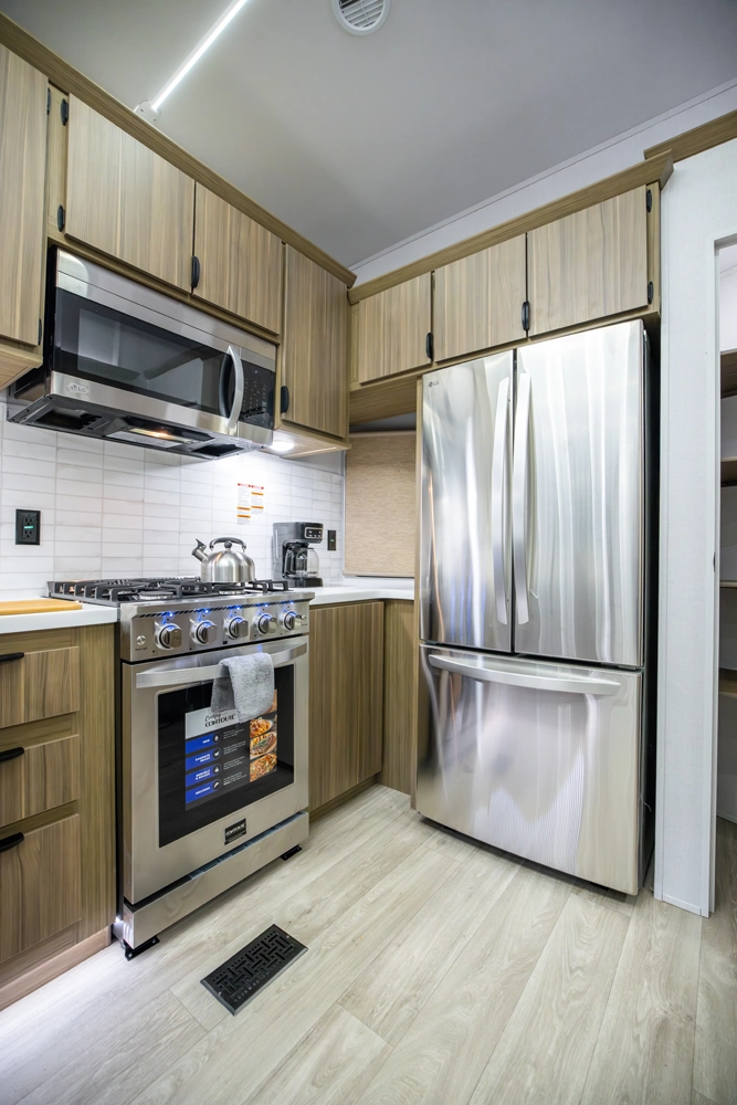 The Wildwood Grand Lodge 42FK is a truly exceptional destination trailer. The large front kitchen is equipped with residential appliances, tons of cabinet and pantry space, and a free-standing dinette. The large living area provides two sofas and an entertainment center with TV and fireplace, while the large rear master bedroom offers a full wardrobe and dresser. The HUGE walk-up loft is perfect for friends and family, with four separate bunks and plenty of space to stretch out.