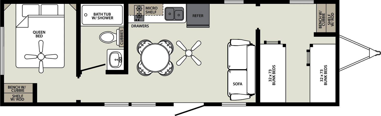 This 385 sq ft layout features two bedrooms and a full bath, giving more room for friends, family, or adventure gear. The design blends durability with comfort and makes it easier to enjoy multi-day stays at parks or outdoor resorts with confidence in its build quality.