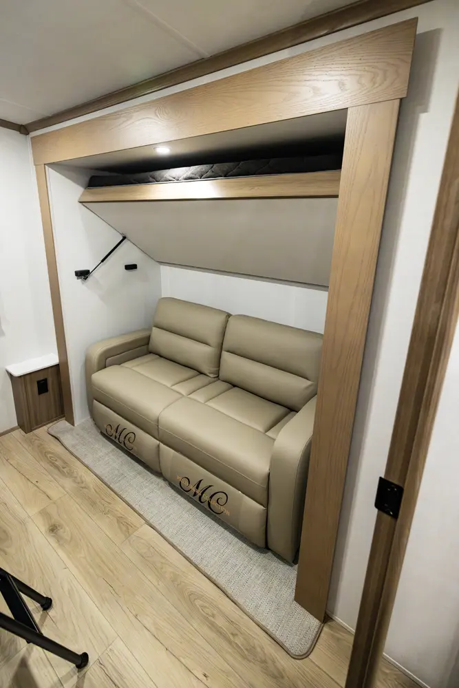 This four slide bunk model has great sleeping arrangements and a U-Dinette that can seat everyone for dinner. The outside camp kitchen has a large refrigerator and cooking stove to feed everyone you are sleeping for the trip. The bunkroom has its own entertainment and hard door for separation from the rest of the coach. The king bed option and the washer and dryer prep make this coach great on every occasion for any family.