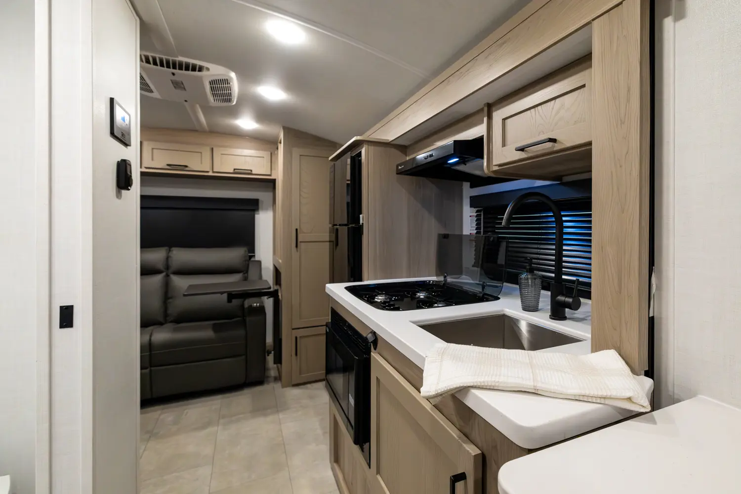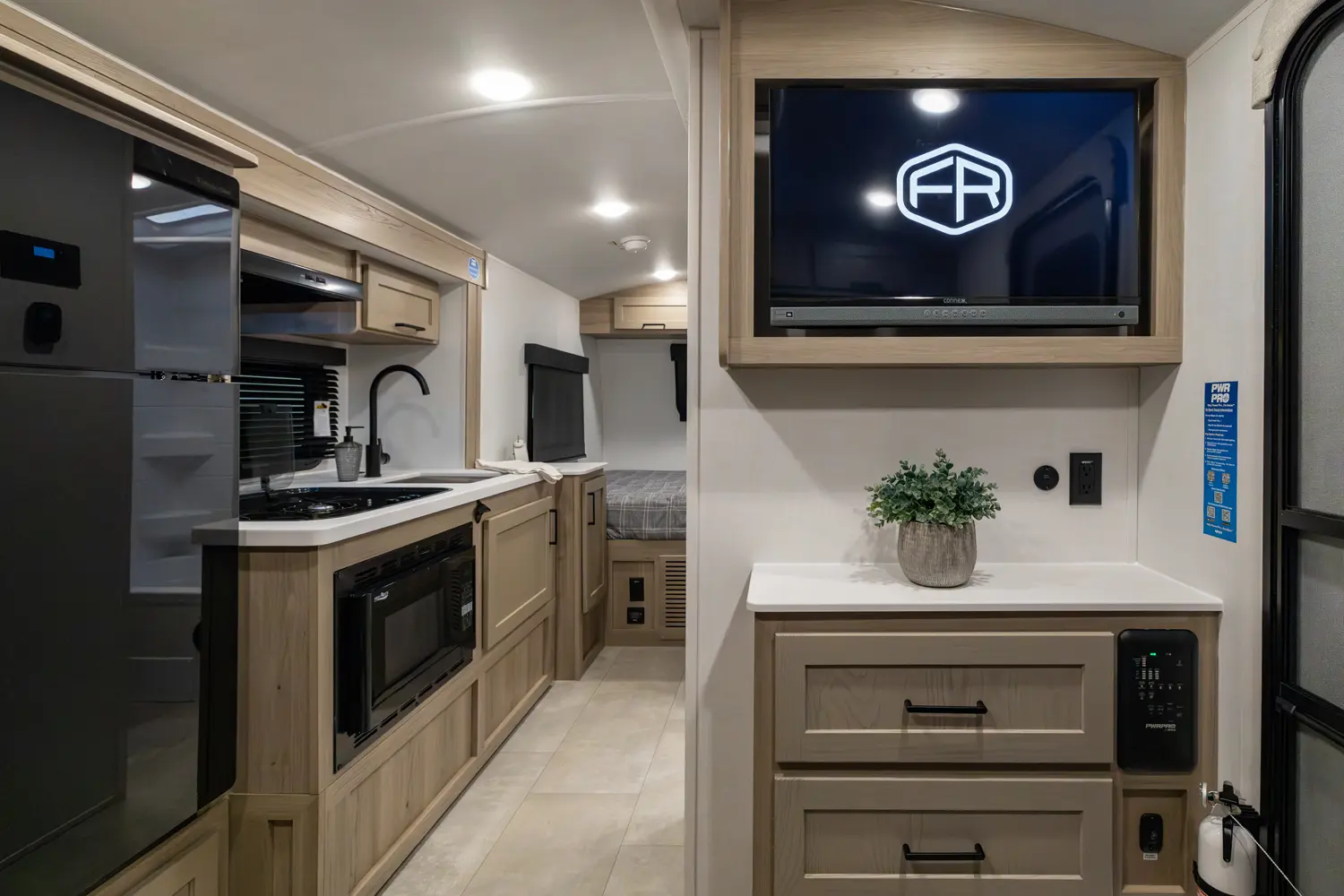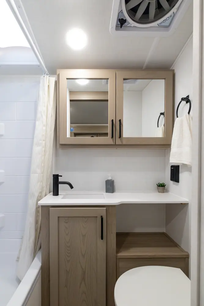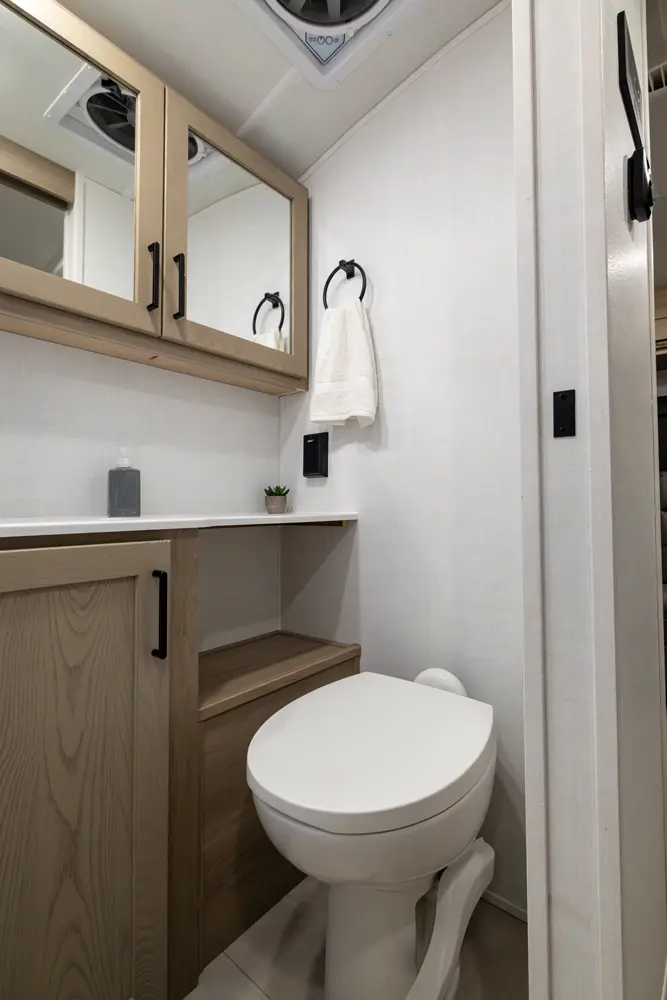 The E-Pro 19RL brings big comfort to a compact trailer. It’s the first E-Pro with theater seating, giving you a more relaxed and residential feel inside a lightweight camper. The smart rear living layout, efficient kitchen, and versatile sleeping space make it perfect for couples who want easy towing without sacrificing comfort or modern features on the road.