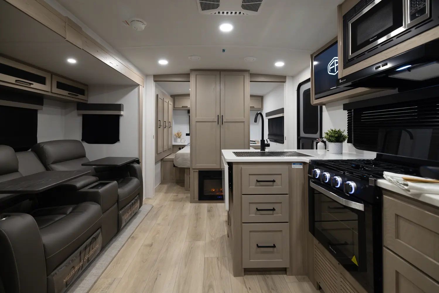 The outside kitchen on this Flagstaff Micro Lite featuring our new griddle, a refrigerator and grill makes cooking so enjoyable and flexible. No need to take the smell of cooking bacon inside. The large wardrobe slide makes packing and organization so easy. The large pantry next to the bathroom covers all your kitchen storage needs as well. The center position of the television in your entertainment spaces makes viewing from any part of the living quarters easy.
