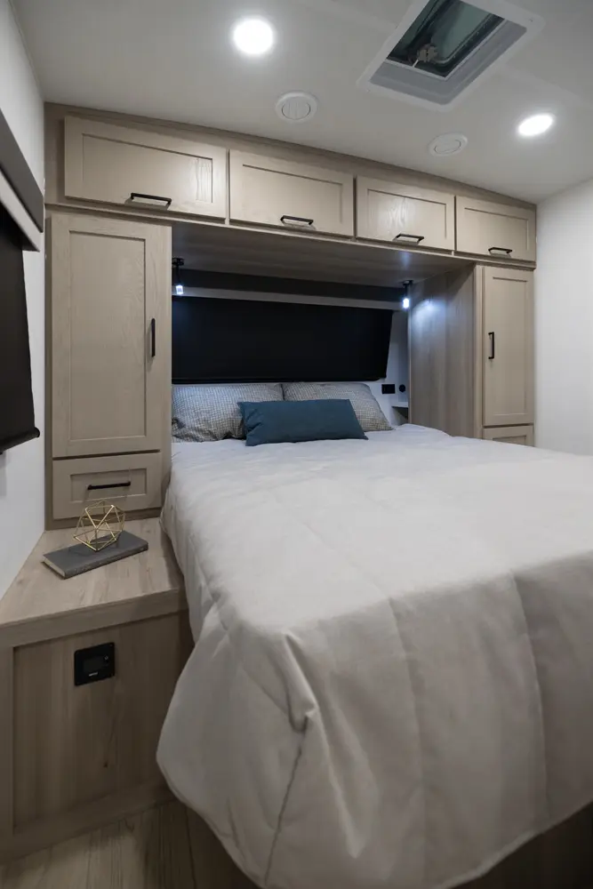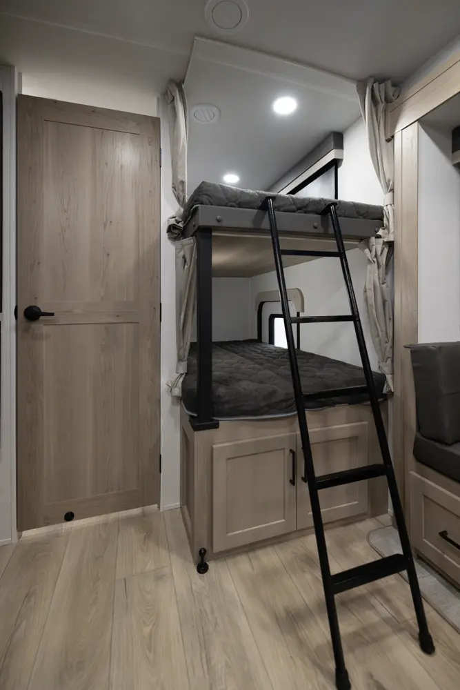 The 25DBH is a bunkhouse layout featuring a segregated front bedroom with a true queen bed and dual wardrobe closets for plenty of personal storage. In the main living area, you'll find a large U-shaped dinette, a spacious kitchen and two 36" x 71" bunks- perfect for kids or guests. This layout blends privacy, comfort, and roominess. An ideal setup for families and groups seeking versatile space on the road.