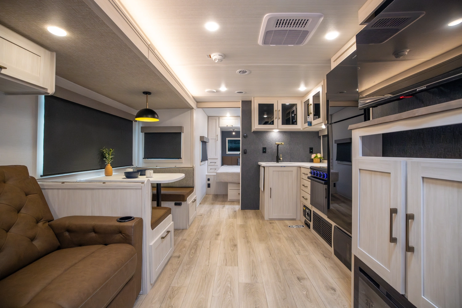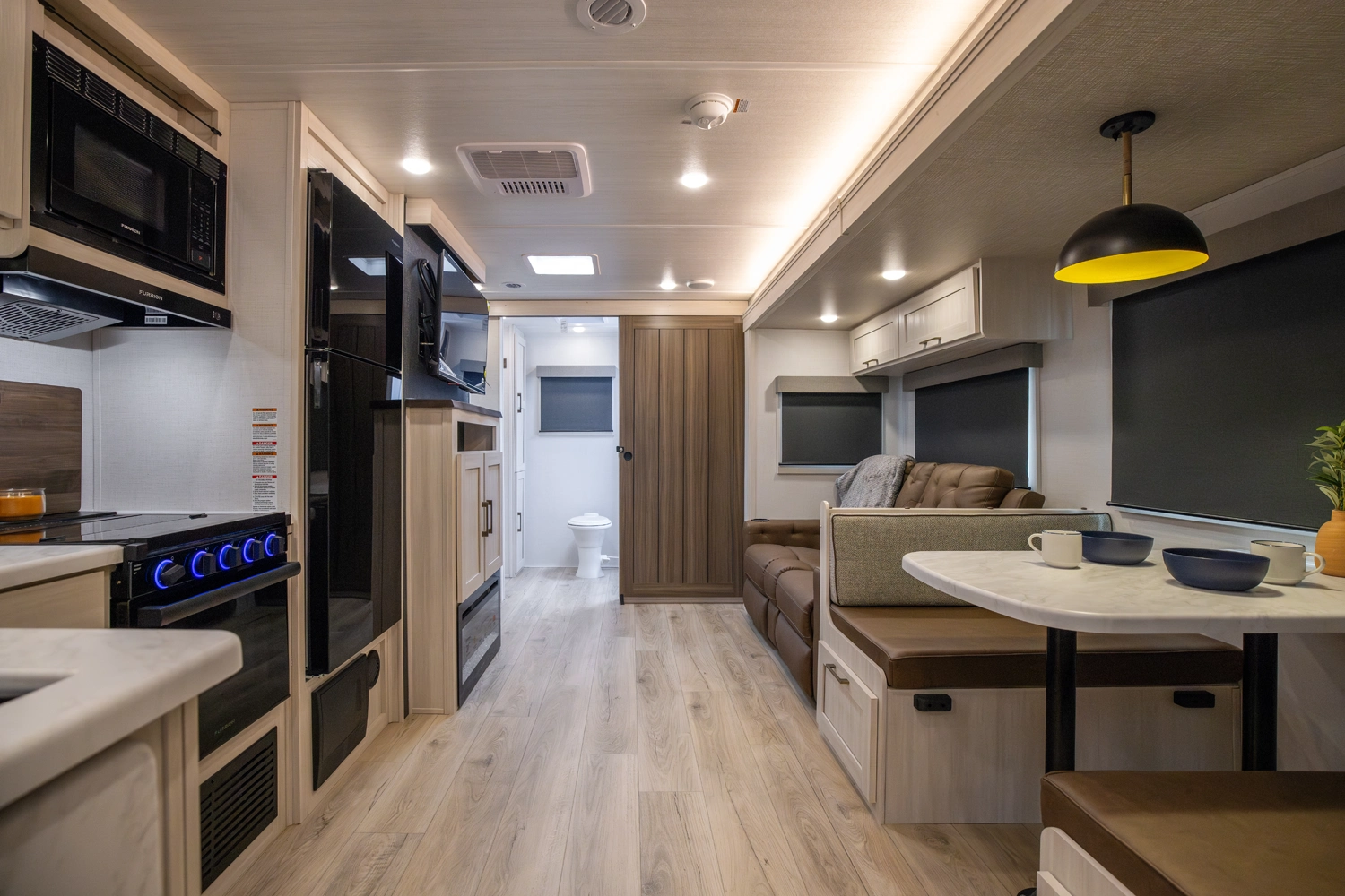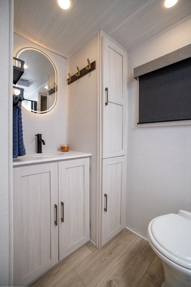 Sleeps 6. Tow vehicle 6800 lbs. minimum. No roughing it in this top selling model with walk in pantry, cook up a feast with sizable countertop space w/extension, and beautiful Barn Door concealing a big rear bathroom. Go down any road knowing you have the best in class nights rest coming in your master suite; “Cubbie” storage, large wardrobes, cavernous OH, drawers, USB’s, massive under bed storage. To top it off we added an outside kitchen!