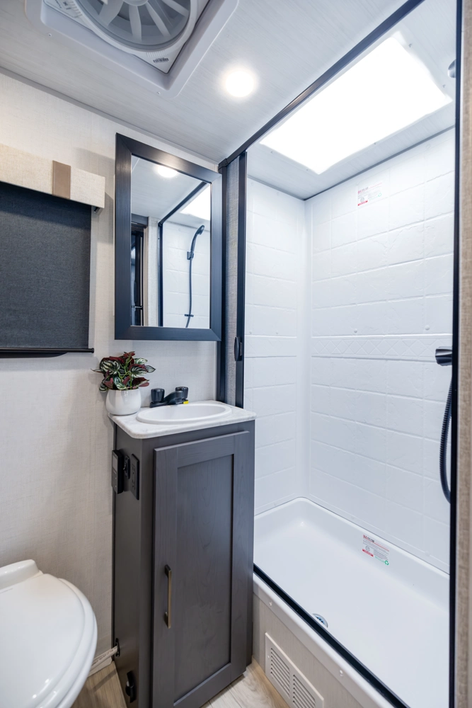 The 19QRB is a feature-rich, tow-friendly travel trailer that blends comfort, function, and durability. A front queen bed provides a cozy retreat with ample storage, while the central kitchen, complete with a large fridge and air fryer microwave to make meal prepping effortless. The slide-out sofa adds spacious comfort for relaxing or entertaining, and the rear bath features an upgraded shower and high-power fan. Built for extended-season use, the 19QRB is ready for adventure.
