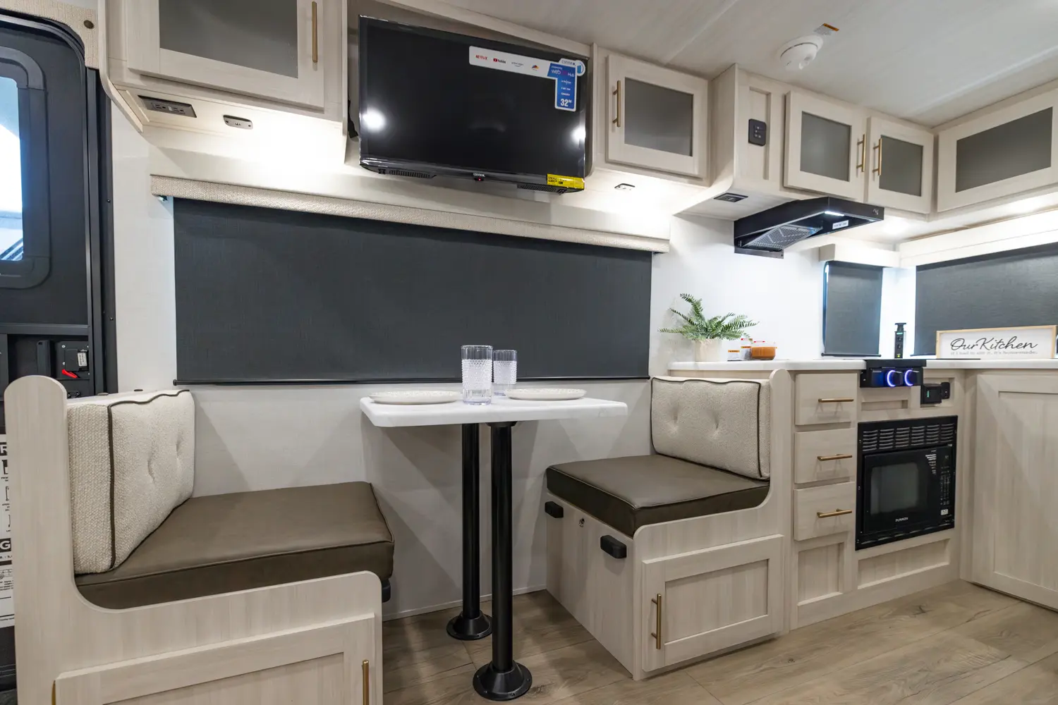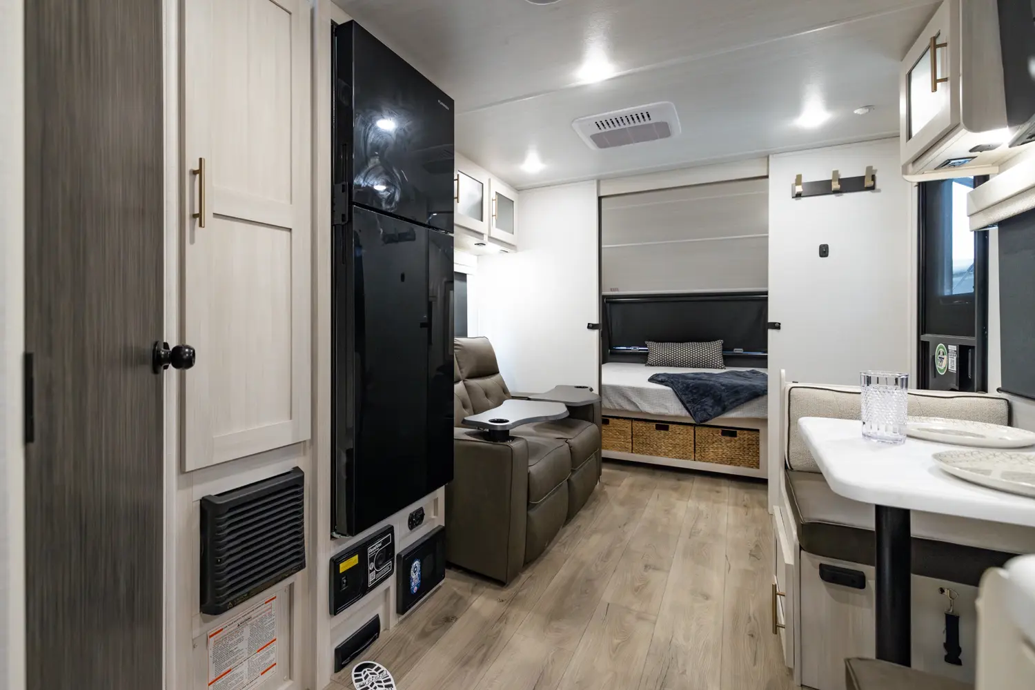The RP-205 blends lightweight towing with a spacious layout. A private queen bedroom offers comfort and privacy, while the rear corner kitchen and booth dinette create a functional living space. The full bath adds convenience, and the theater seating enhances comfort. With modern finishes and smart storage, this no slide trailer is ideal for couples or small families seeking compact, full-featured adventures.