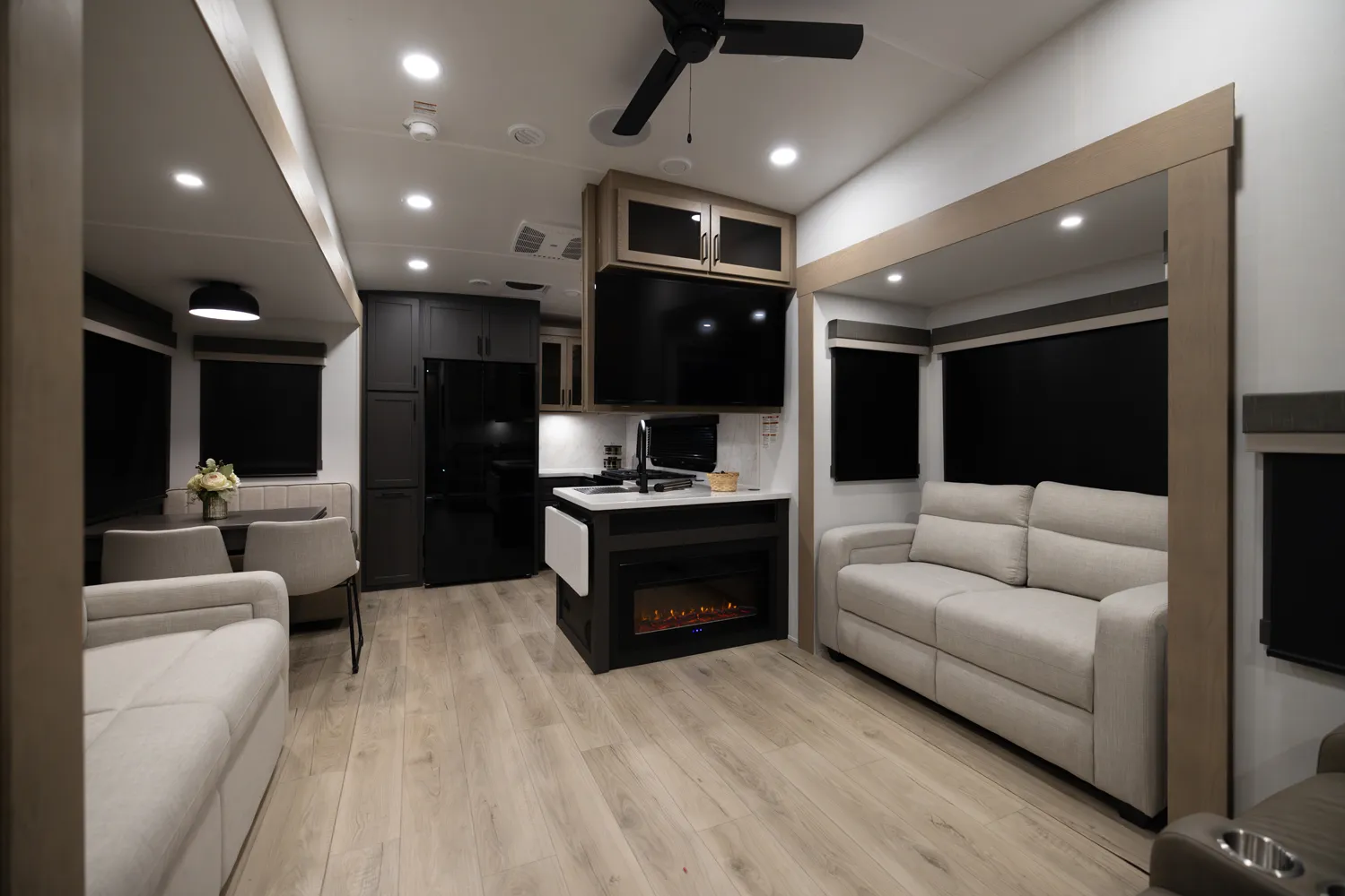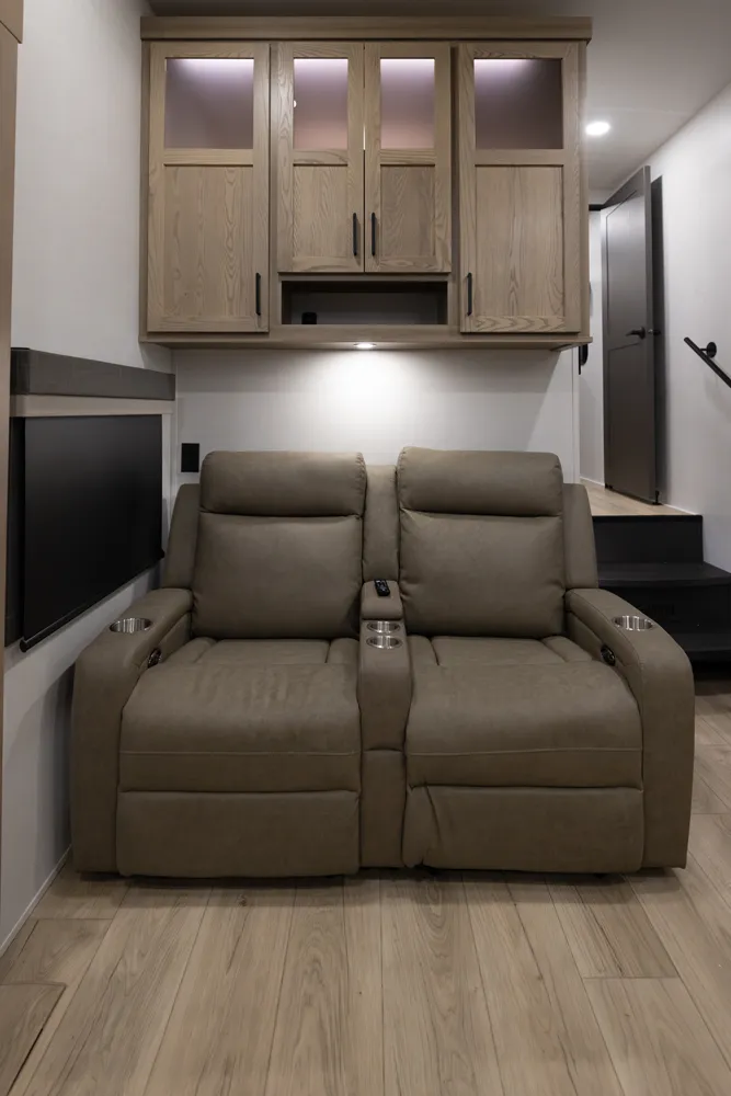 One of the best entertainment centers in the industry! This 371RK 5th wheel will entertain your family and friends for a night of relaxation after a long day of camping. It features a 68" Hide-a-Bed, a 60" Hide-a-Bed & 60" theater seating. Its front bedroom features a queen bed, (optional King) massive wardrobe storage & Washer/Dryer prep. The rear kitchen offers tons of counterspace paired with ample cabinet space, drawers, pantry storage & a trash can drawer.