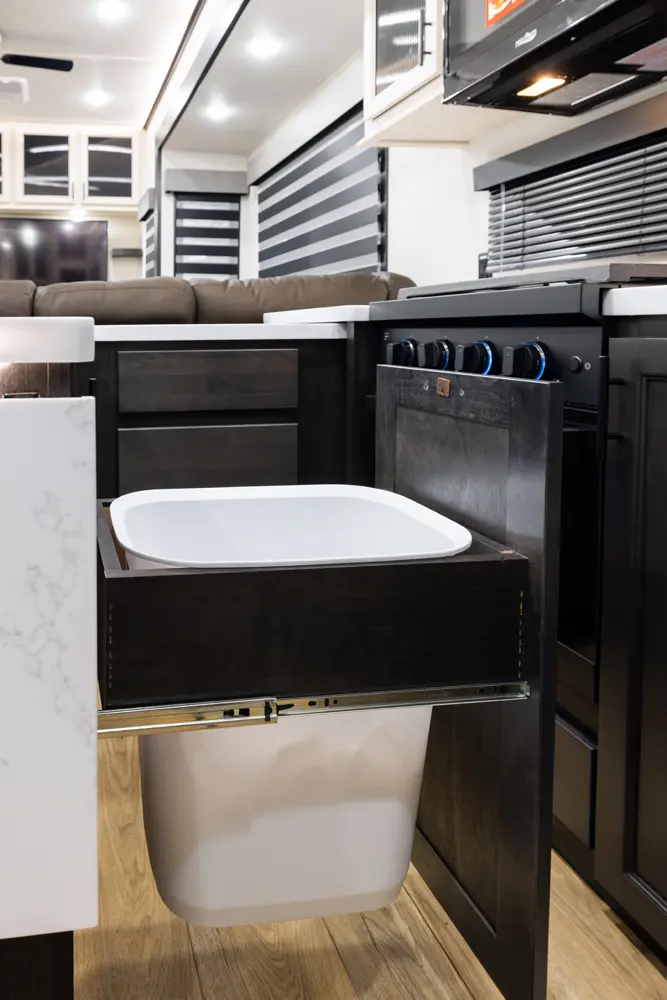 Discover the future of 5th wheel RV living with the Sabre Sundeck 33RLP by Forest River. This innovative RV features an industry-first retractable patio deck, extending your outdoor living space. Inside, you’ll find a L-shaped sectional, perfect for relaxation, and an impressive entertainment center complete with a fireplace. The fully equipped kitchen is a chef’s dream, boasting ample solid surface countertops, a residential-style oven, an air fryer microwave, and a 12-volt refrigerator.